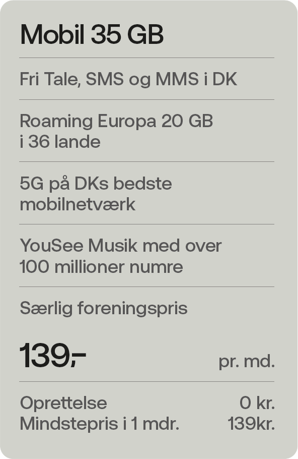 Du kommer på TDC NETs mobilnet, som er målt som Danmarks bedste af Teknologisk Institut for 8. år i træk. Så kan du ringe, sende beskeder, streame film og musik og surfe online på en lynhurtig og stabil forbindelse med markedets bedste dækning. Med YouSee Musik får du adgang til over 100 millioner musiknumre, som du kan lytte til på din mobil, tablet og pc - når og hvor du vil. YouSee Musik er inkluderet i Mobil 35 GB og Mobil 80 GB abonnementet. I alle abonnementer får du Roaming Europa, så du kan tage din mobil med på rejser til 36 lande i Europa uden at bekymre dig om regningen.