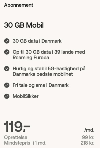 Oplev Danmarks bedste 5G-dækning og de hurtigste hastigheder med et mobilabonnement fra kun 119 kr./md. For at få 5G-oplevelsen, skal du have en 5G-mobiltelefon.